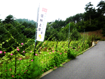 朝顔の向こう側はリンゴ畑。信州ってリンゴの産地だったなーって思った。